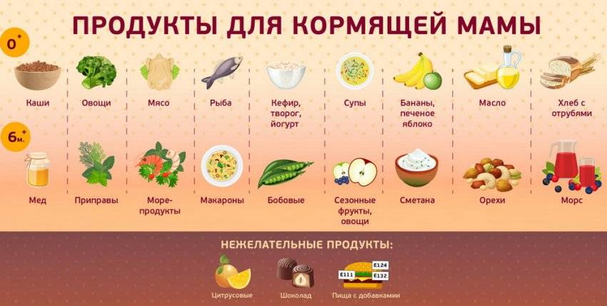 В таблице представлена диета при кормлении грудью в разные периоды после родов: