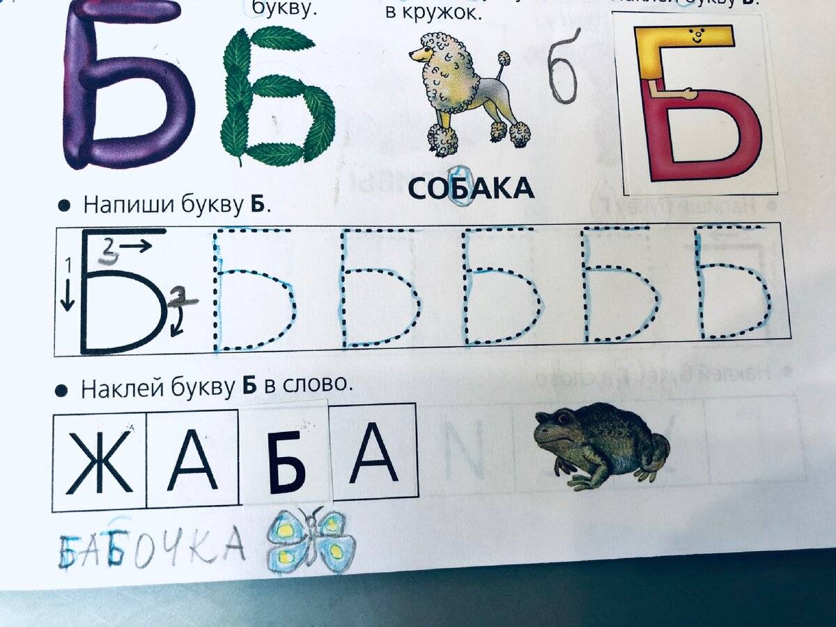 Изучение буквы Б. Внизу я дорисовала бабочку и поодписала слово БАБОЧКА. Потому что с “Собакой” и “Жабой” Максу было совершенно непонятно, какая буква изучается