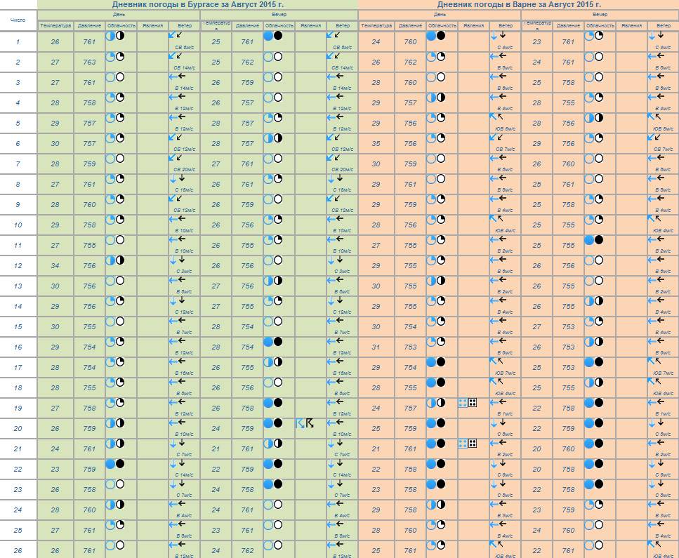 Купальный сезон в Болгарии начинается примерно с середины июня. К этому времени море успевает прогреваться до 22-23 градусов тепла и заканчивается в начале октября. Для сравнения, добавляю картинку архива погоды для Бургаса и Варны за август 2015 года.