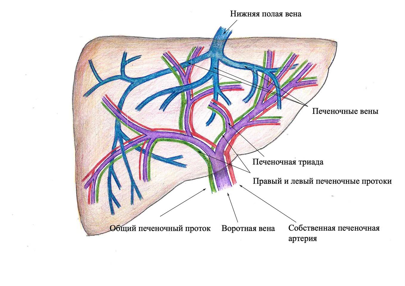 У взрослого человека имеет вес около 1/40 от общей массы тела (приблизительно 1,6 кг у мужчин и 1,2 кг у женщин). Печень обладает двойным кровоснабжением: приблизительно 80% крови, приходящей в печень, поступает из воротной вены (венозная кровь, собранная от всех непарных органов брюшной полости), остальная часть (артериальная кровь, обогащенная кислородом) – из печёночной артерии. Войдя в ворота печени, оба сосуда дают многократно ветвящиеся более мелкие сосуды. На выходе из печени образуются 3-4 печёночных вены, которые впадают в нижнюю полую вену.