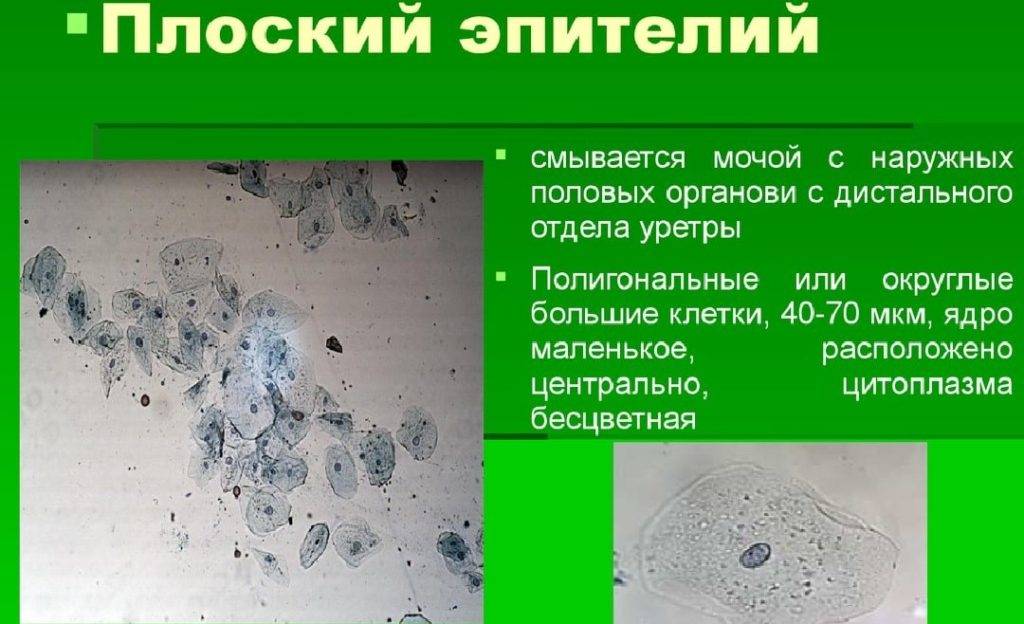 Плоский эпителий у лиц мужского пола при правильном туалете не обнаруживается вообще. У женского пола допускается до 5 клеток с учётом эпителия из влагалища.