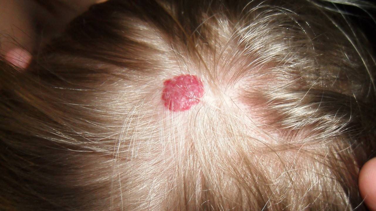 Образование капиллярного типа, представляющее собой нарост цветом от бордового до слабо выраженного розового, разрастается в окружающие ткани. После надавливания становится бледным, быстро принимая первоначальный вид. Гемангиома на голове у ребенка, локализующаяся на коже лобной части, получила название «поцелуй ангела», на затылочной части — «укус аиста». Несколько возвышаясь над кожным покровом, гемангиома поверхностная имеет ровные, четко выраженные очертания (когда рост остановлен и наступает фаза уменьшения) либо расплывчатые (находится в процессе активного разрастания).