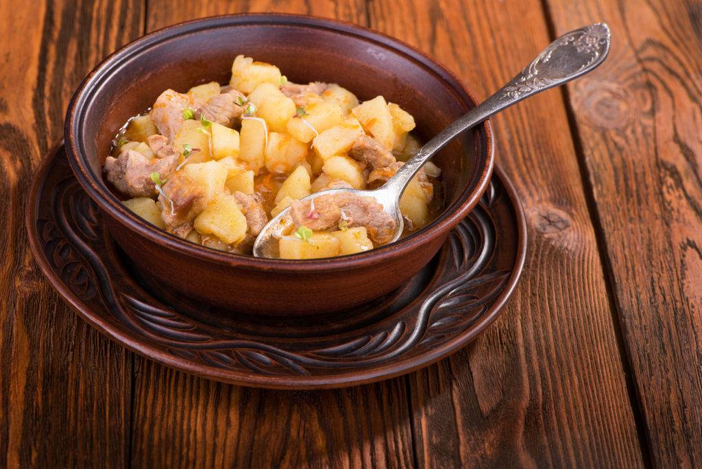 Промыть мясо, помыть и почистить овощи. Мясо, картошку и лук нарезать кубиками, морковку натереть на крупной терке. Добавить все ингредиенты в емкость для приготовления, залить водой, посолить, добавить лавровый лист. Тушить на среднем огне до готовности мяса, примерно 45 минут.