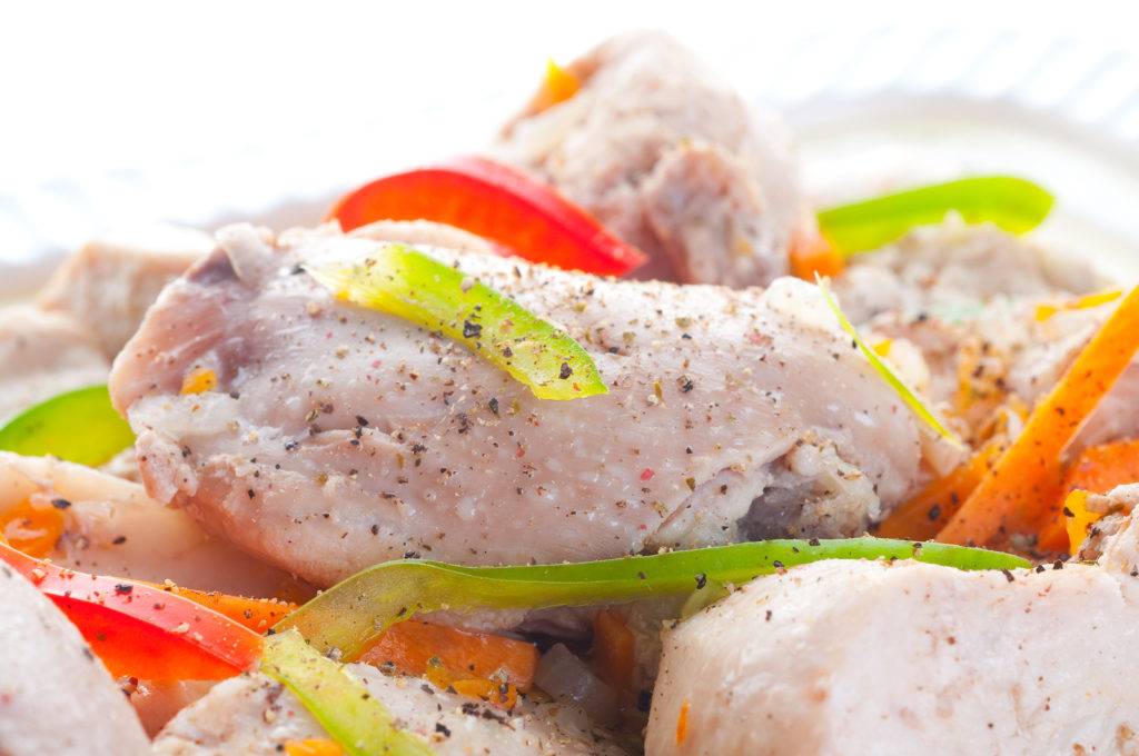 Овощи помыть, порезать, запечь в духовке или на гриле. Мясо промыть, отварить до готовности. Запеченные овощи очистить от кожицы, порезать крупными ломтиками. Готовое филе остудить, нарезать полосками, смешать с овощами, посолить и заправить маслом.