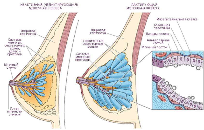 На ранних сроках беременности эпителий интенсивно разрастается, образуя тканевые структуры для производства молока. На поздних сроках беременности и в период лактации эпителиальные клетки дифференцируются дальше, чтобы стать специализированными для выработки компонентов молока. После завершения лактации отлучение ребенка от груди вызывает постлактационную инволюцию.