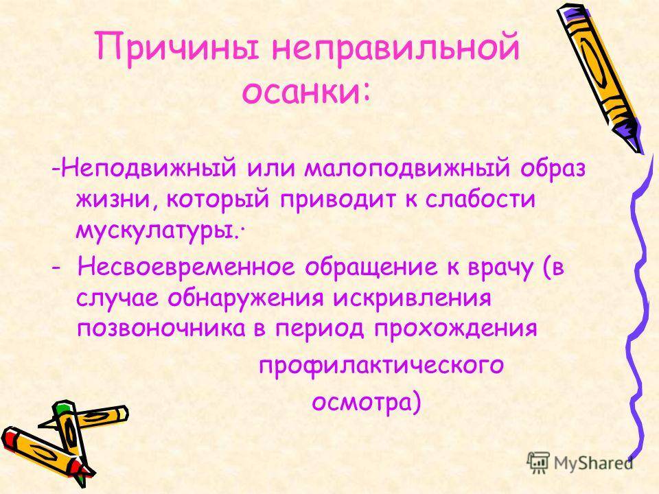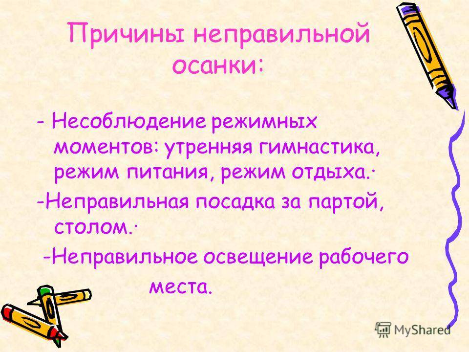 Причины неправильной осанки: – Неравномерная нагрузка – ношение изо дня в день портфеля в одной руке, сумки на одном плече (лучше носить ранец, рюкзак). -Непосильный труд (слишком велик вес предмета при переноске)· -Неправильная поза при стоянии. -Неправильное сидение за столом.