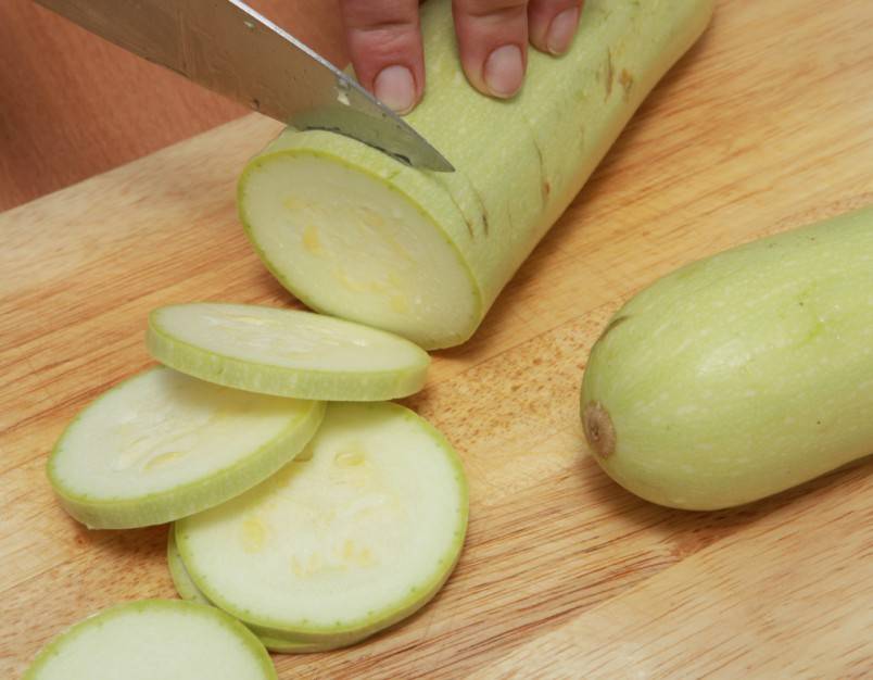 Для начала следует очистить кабачок от кожуры и семян, после порезать кубиками или небольшимикружочками. Заранее необходимо поставить воду в кастрюле, чтобы добавить овощ в уже кипящую жидкость, причем ее должно быть немного, чтобы она немного покрыла овощные кружки.