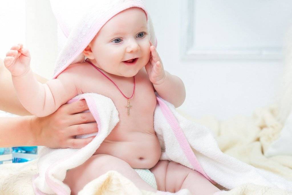 По рекомендациям европейских педиатров сразу после купания ребенка нужно не одеть, а укутать3. Укутывание предотвращает резкое снижение температуры тела в первые 10 минут после купания, при этом малыш все еще может ощутить телесный контакт с мамой3.