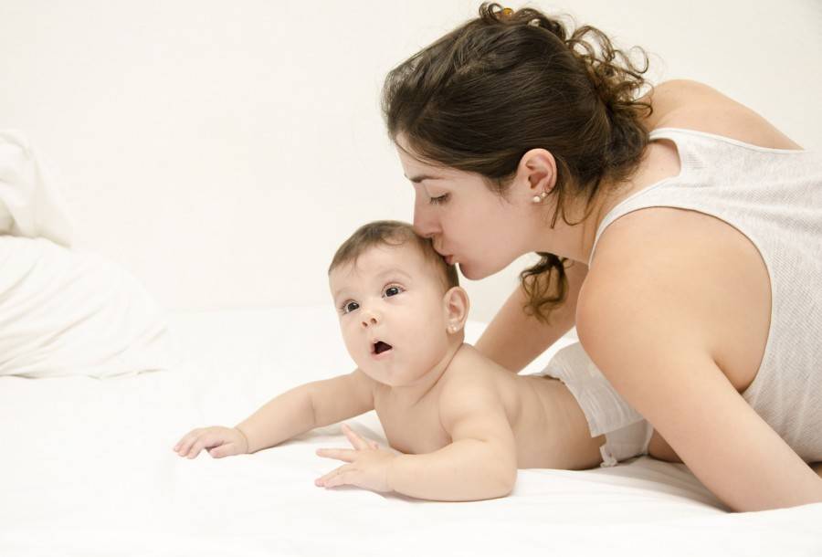 Мама и малыш занимаются гимнастикой, чтобы быстрее научиться ползать