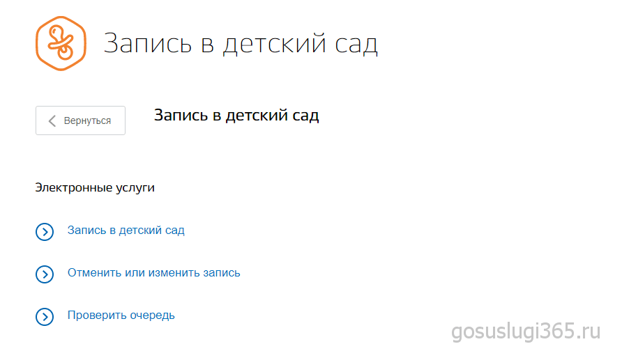 На открывшейся странице появится список, где вам предложат записать ребенка в детский сад, отменить или изменить запись, а также проверить очередь. Нажмите на первый пункт.