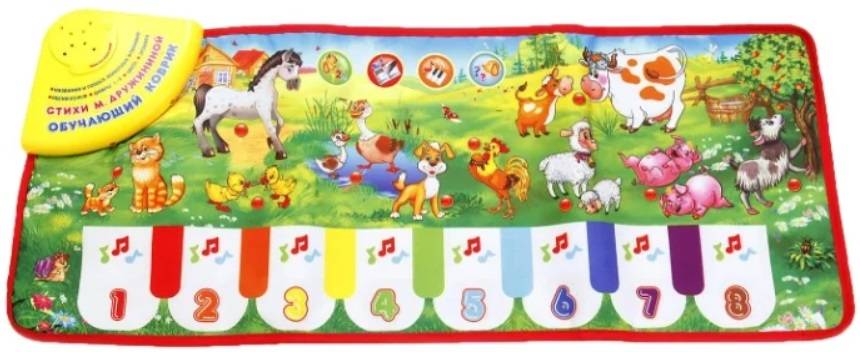 Популярная модель российского производства предназначается для самых маленьких детей от 6 месяцев, активно познающих мир. Прямоугольное изделие имеет небольшие размеры 72*29 см. На фото видно, что на рабочей поверхности нанесены рисунки животных, при нажатии они издают характерные звуки. Нарисованные клавиши исполняют знакомые песни В. Шаинского и короткие стихи м. Дружининой.