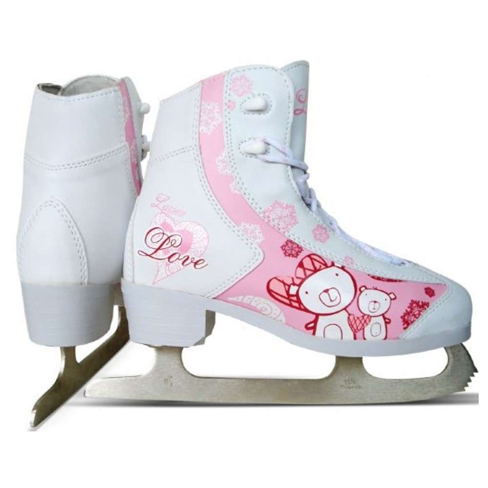 Топ детских коньков открывают очень красивые внешне коньки Larsen Love. Модель полностью изготовлена из винила, что снижает ее долговечность. Однако на этом неприятности заканчиваются, так как высокопрочные металлические лезвия способны показывать лучшие эксплуатационные свойства. За счет крючков нога дополнительно надежно фиксируется.