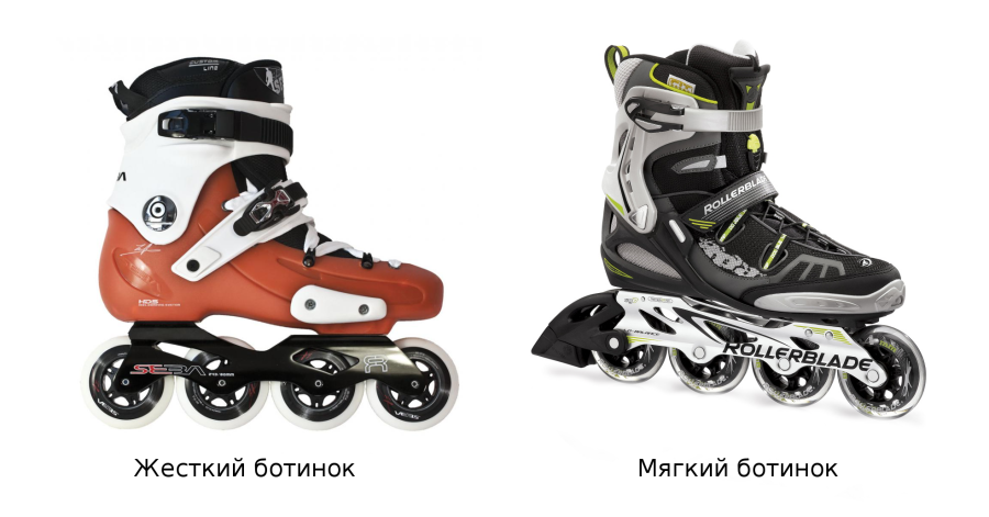 Бывает жестким и мягким. Жесткий ботинок выполняется из пластика с мягким сапожком для комфорта. Сапожок съемный, что позволяет его периодически стирать. Преимущества жесткого ботинка — это хорошая боковая поддержка ноги и износостойкость, за которую приходиться платить повышенным весом. И именно вес является главным недостатком. Он приводит к быстрой усталости, что сокращает время езды. Иногда, но это скорее из-за не верного выбора размера, жесткий ботинок может натирать ногу. Мягкий ботинок комфортный, с хорошей вентиляцией, более легкий. Но боковая поддержка хуже. Поэтому ролики для детей делают, в основном, с жестким ботинком для избежания растяжений. Мягкий ботинок все же усилен пластиковыми конструкциями и использует зачастую все виды креплений ноги (шнуровка, клипса, пяточный ремень).