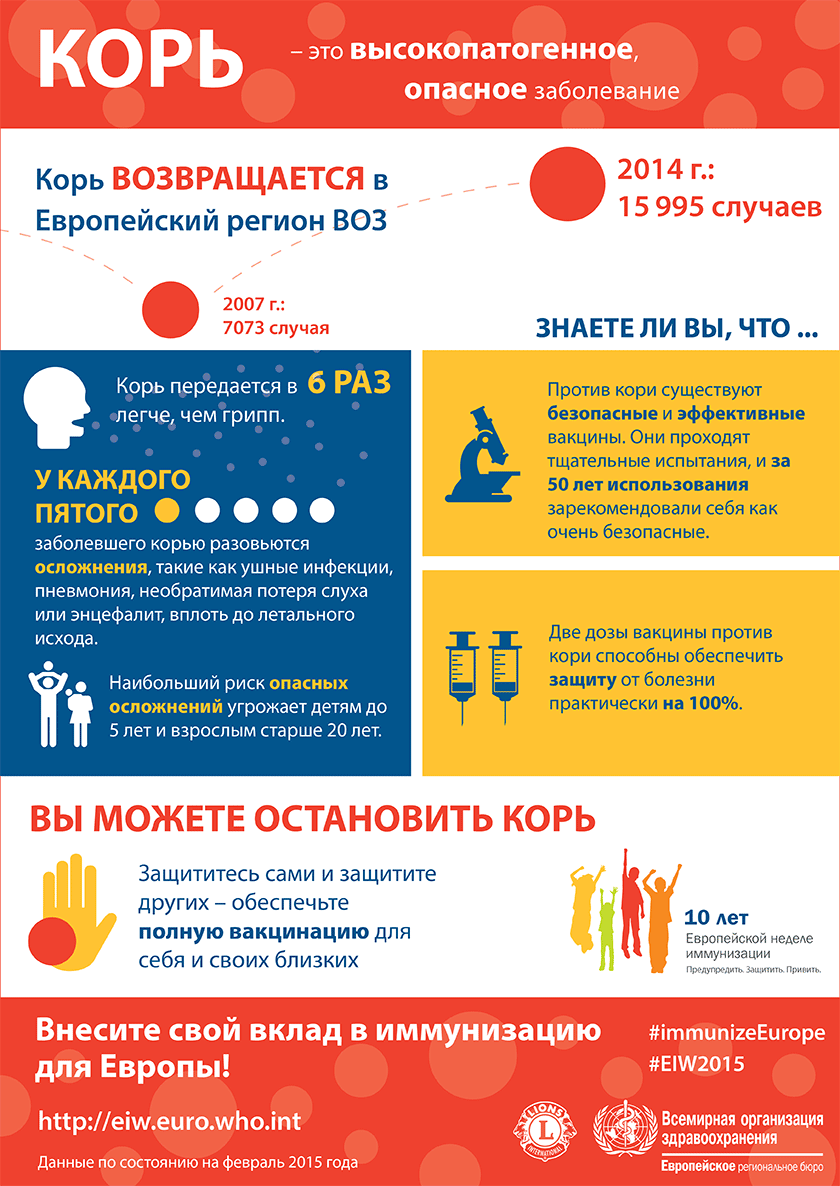 Корь — это инфекционное заболевание, вызываемое очень заразным вирусом, который живет в слизистой оболочке носа и горла инфицированного человека. Вирус распространяется воздушно-капельным путем через кашель и чихание и контактным при рукопожатиях или других контактах, в том числе через поверхности, к которым прикасался инфицированный человек – такие как посуда, столовые приборы, игрушки, дверные ручки, клавиатуры. Вирус кори может жить до двух часов в воздушном пространстве, где зараженный человек кашлял или чихал, или на поверхностях, которых он касался загрязненными слизью руками. Поэтому, если другие люди вдыхают загрязненный вирусами воздух или касаются зараженной поверхности, а затем касаются глаз, носа или рта, они могут заразиться. Корь настолько заразна, что, если она появилась у одного человека, то 90% близких ему людей, которые не имеют иммунитета, также заразятся. Зараженные люди могут распространять корь среди других в период от четырех дней до появления сыпи, до четырех дней после ее появления. Некоторые люди считают, что корь — это лишь небольшая сыпь и лихорадка, которая проходит через несколько дней, но корь может вызвать серьезные осложнения со здоровьем. Невозможно заранее определить степень тяжести симптомов, с которыми столкнется ваш ребенок. Каждый четвертый заболевший корью – госпитализируется. Корь может привести к серьезным осложнениям, особенно у детей в возрасте до 5 лет и у взрослых старше 20 лет, таким как пневмония, отит, энцефалит, менингит или даже летальный исход.