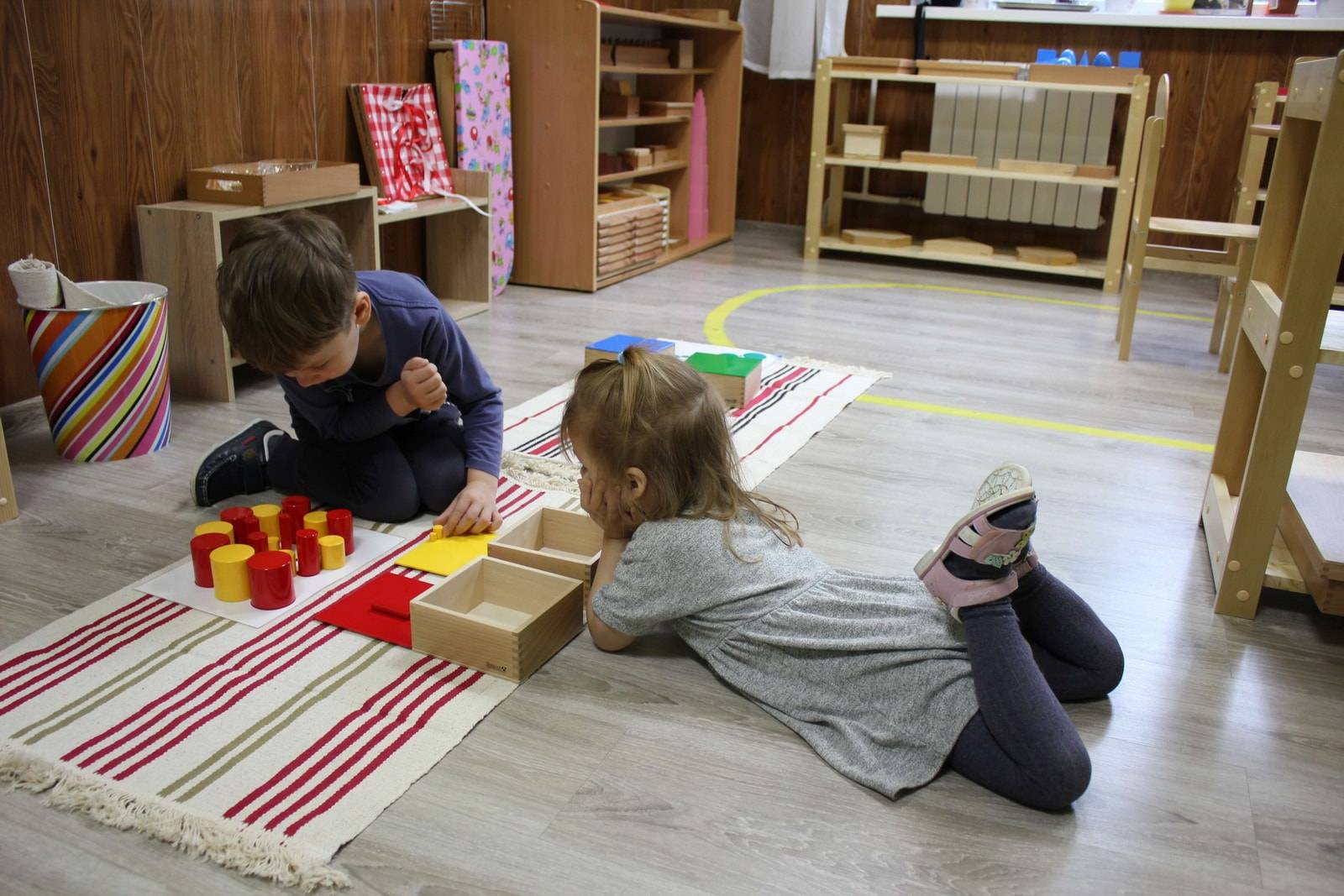 - Один ребенок работает с одним материалом. Это позволяет сосредоточиться. Если материал, который малыш выбрал, в данный момент занят, следует ожидать, наблюдая за работой сверстника, или выбрать любой другой.