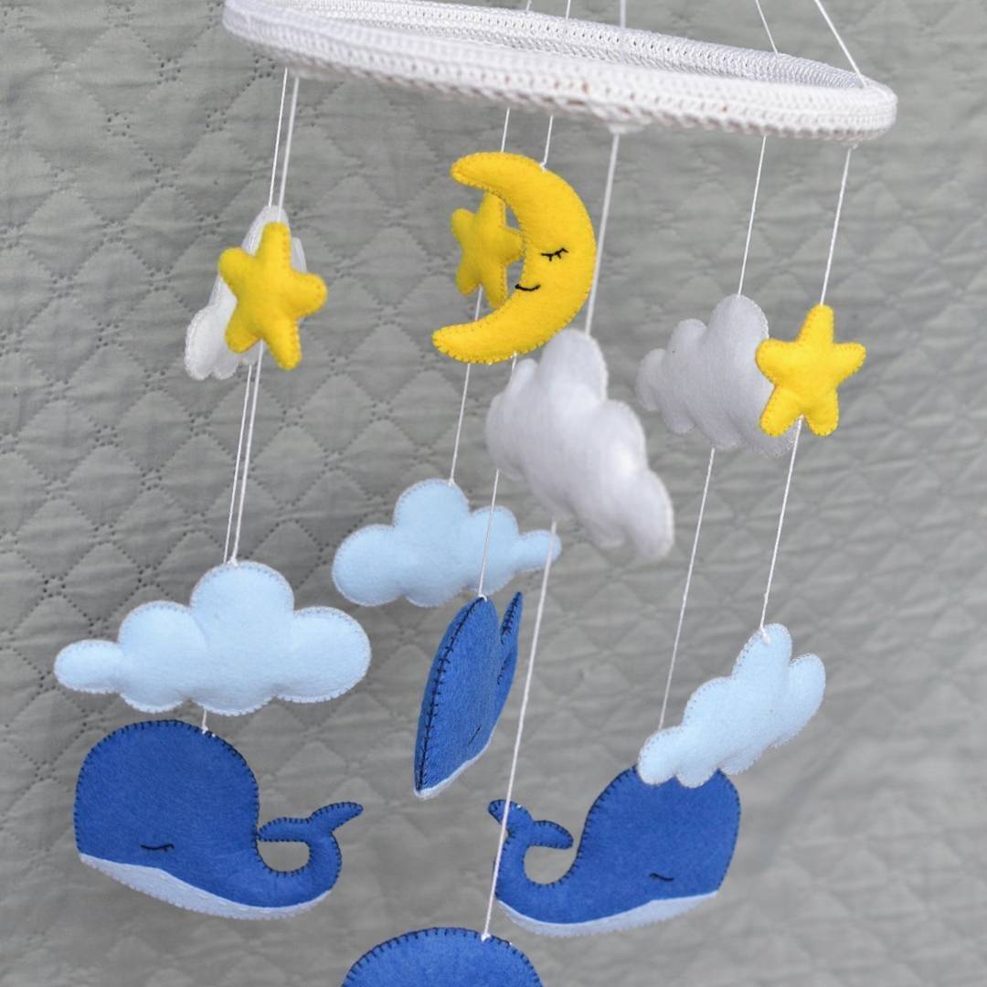 Электронный мобиль — универсальный и удобный вариант. Источником писания служит аккумулятор или батарейка. Благодаря этому конструкция вращается от 5 до 30 минут, не останавливаясь. Самые «продвинутые» модели оборудованы плеером, чтобы можно было загрузить свой вариант мелодии с флешки. Красиво смотрятся мобили, оборудованные ночником-проектором, создающим имитацию звездного неба или проецирующим изображения фигурок животных, рыб или растений. Есть возможность регулировки громкости звука.