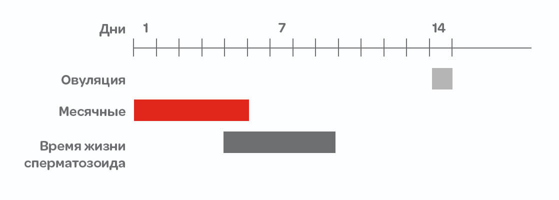 Немного упростим два этих рисунка и соберем их данные вместе. В итоге получим логичный вывод: у сперматозоидов, попавших во влагалище даже в последний день менструации, нет шансов дождаться овуляции, поэтому вероятность забеременеть во время месячных у женщины «из палаты мер и весов» равна нулю.