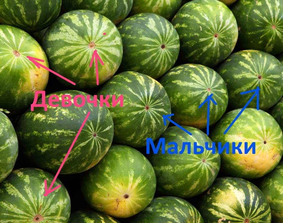 - В Украине существует народная примета, о том, что якобы бывают арбузы-мальчики и арбузы-девочки. У арбуза-девочки коричневая точка в месте где рос цветок — большая, у арбуза-мальчика — она маленькая. Арбузы «женского пола» всегда вкуснее и слаще на вкус, хотя найти логическое объяснение этому очень сложно