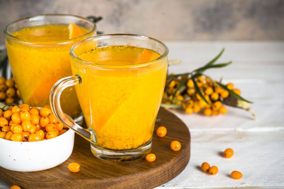 - Чай. 150 г растёртой мякоти облепихи (количество указано для 4–5 чашек) развести тёплым кипятком до консистенции жидкого пюре. Разложить по чашкам и залить горячим чаем. Добавить мёд по вкусу.