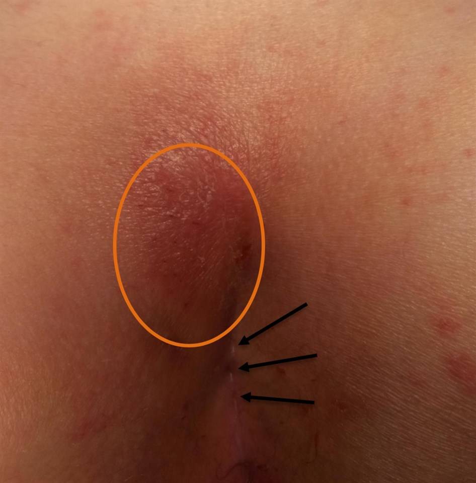 Рисунок 4. Абсцесс эпителиального копчикового хода (стрелками указаны первичные отверстия, расположенные в межъягодичной складке. Область предполагаемого абсцесса ограничена оранжевой линией)
