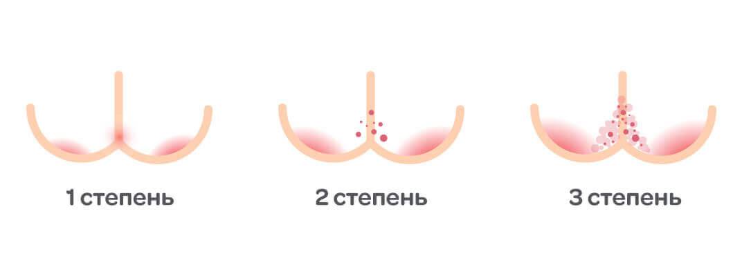 На следующей стадии у малыша возникают сильные опрелости — их цвет становится более интенсивным, появляются повреждения поверхностного слоя кожи (эрозии). Опрелости второй степени вызывают у младенца беспокойство. Он может тянуться к ним ручками и нервно реагировать при прикосновении к воспаленным местам, например, при смене подгузника. Эта стадия уже требует специальных средств, но перед тем, как лечить опрелости у младенцев, родителям обязательно нужно проконсультироваться с врачом.