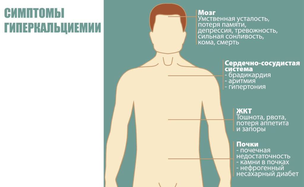 При излишках минерала человек теряет аппетит, появляется чувство тошноты, которое зачастую вызывает рвоту. ЖКТ перестает нормально функционировать, возникают запоры и рези в желудке. Переизбыток кальция нарушает полноценную работу мозга. Ухудшается концентрация внимания, могут возникнуть галлюцинации. Человек постоянно чувствует слабость. Почки не справляются с такого рода минеральным изобилием.