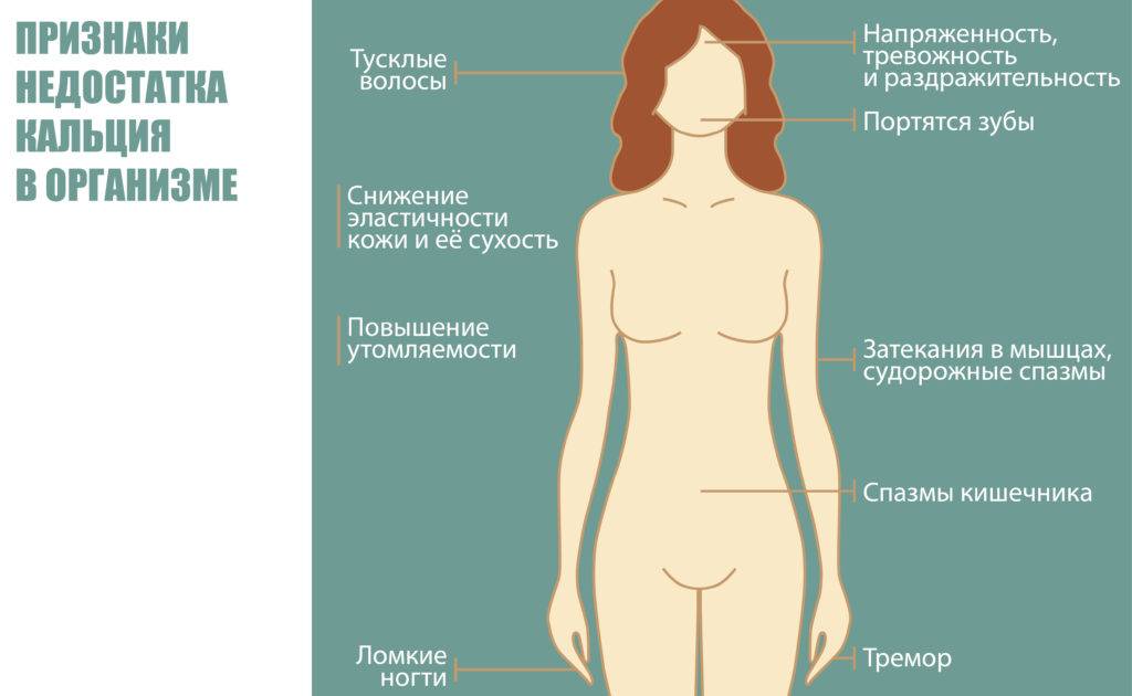 сбои в сердцебиении; искривление позвоночника; плохая работа памяти, путанное сознание; появление спазмов мышц; костная ткань становится тонкой и хрупкой; прогрессирует гипертония; появляются желобки на эмали; кожа постоянно страдает от высыпаний; волосы и ногтевые пластины теряют прочность; повышенная раздражительность.