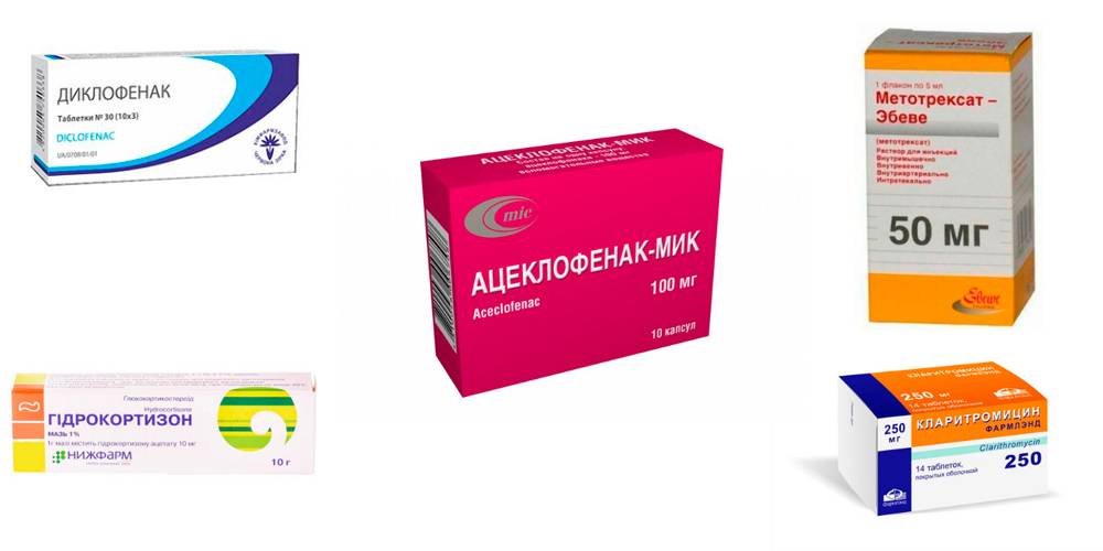 Лечение реактивного артрита начинается с устранения воспаления, отека и болей. С этой целью больным назначают лекарственные препараты группы НПВП. К наиболее эффективным лекарствам относятся Диклофенак, Ацеклофенак, Ибупрофен и другие в виде инъекций, таблеток или наружно (гели, мази).