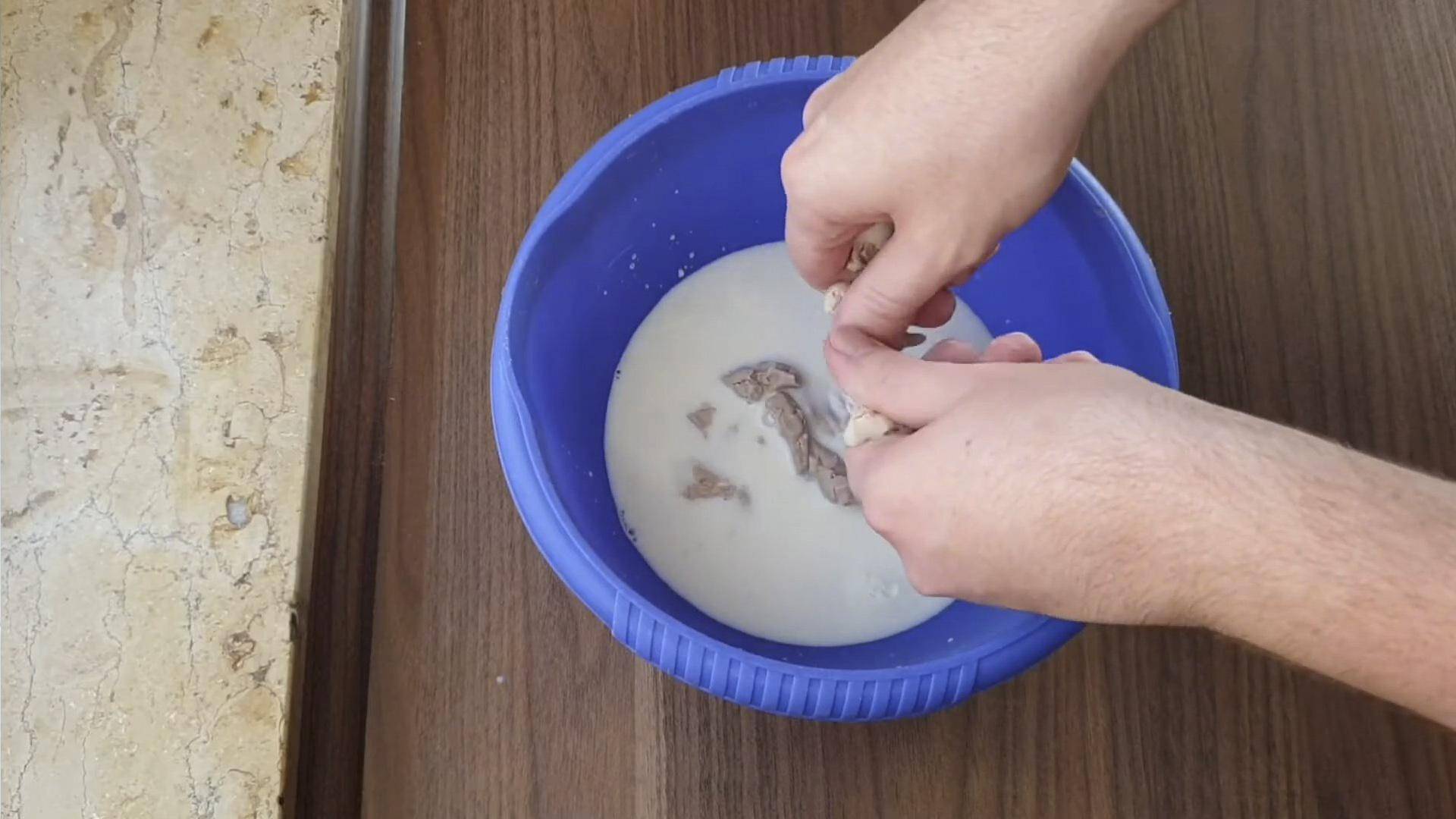 - Один стакан кефира желательно заранее довести до комнатной температуры, после чего влить его в миску.