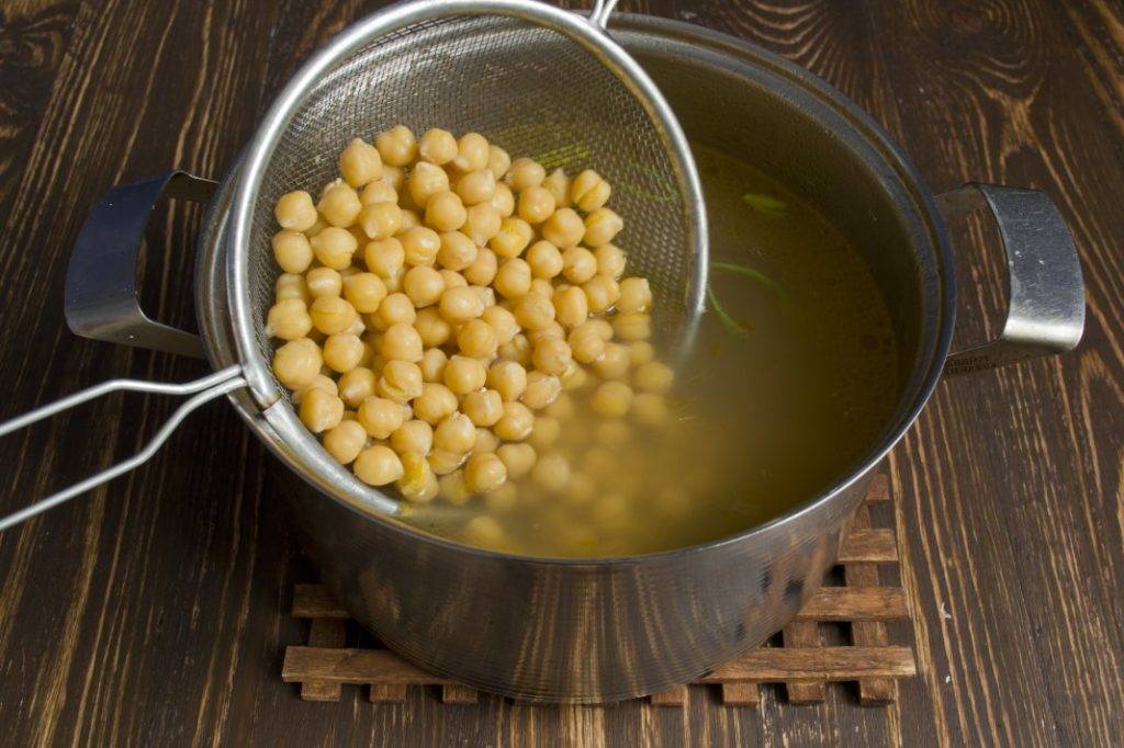 - Варите нут около двух часов на малом огне. Снимайте пену. Нут готов, когда горошины станут мягкими и будут легко разламываться пальцами. Остудите, не сливая отвара.