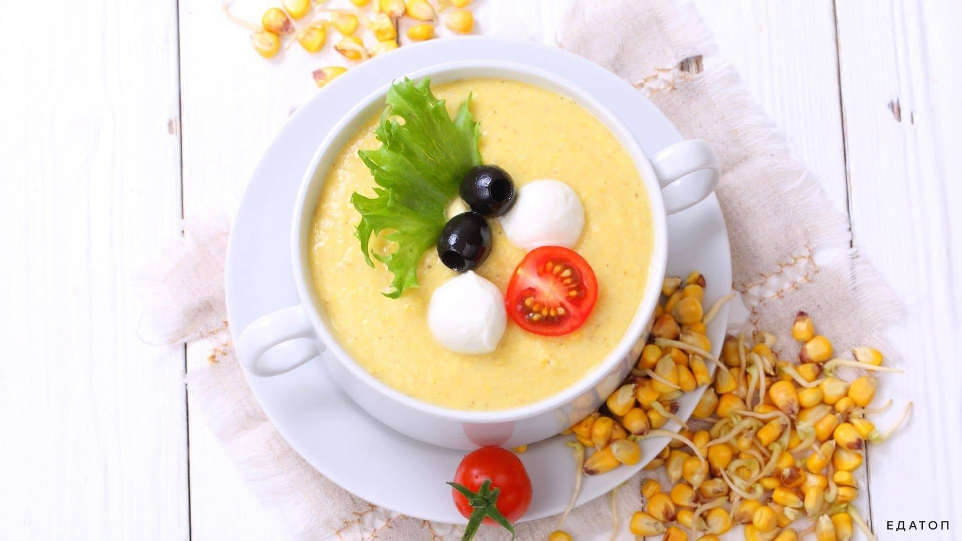 Приготовление. Отварить кукурузу, отделить зерна, перемешать их с бульоном и молоком, после чего вновь поставить на огонь на 10 минут, после чего измельчить с помощью блендера. Перед подачей украсить зеленью. Блюдо подходит для детей от 2 лет.