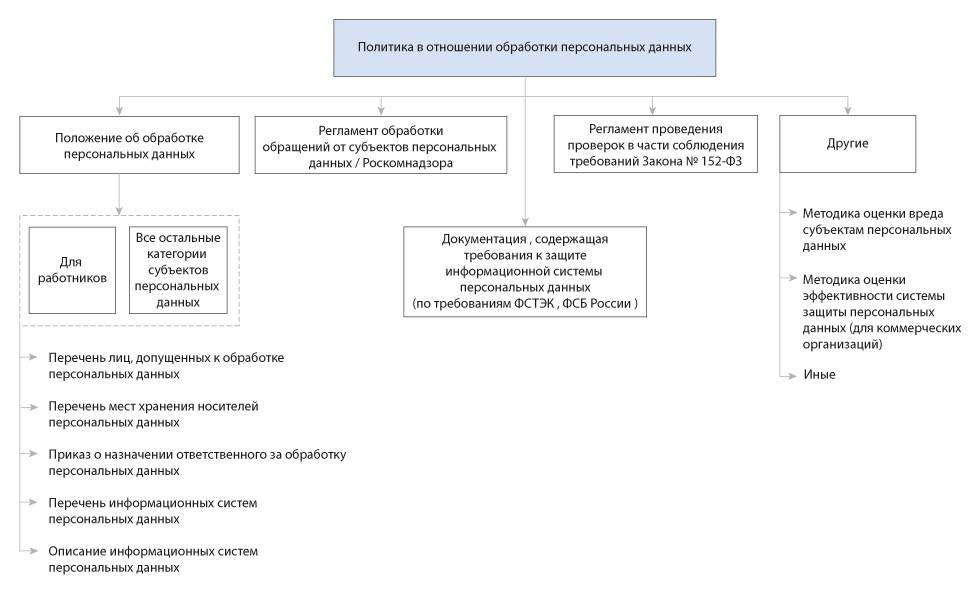 Еще один широко распространенный и не менее важный вид нарушений связан с документацией в области обработки персональных данных. Дело в том, что для полного соответствия требованиям Закона № 152-ФЗ и подзаконных актов организациям нужно иметь огромное количество документов, в иерархии которых не просто разобраться. Как показывают результаты проверок Роскомнадзора, компании допускают три основных нарушения в этой области:
