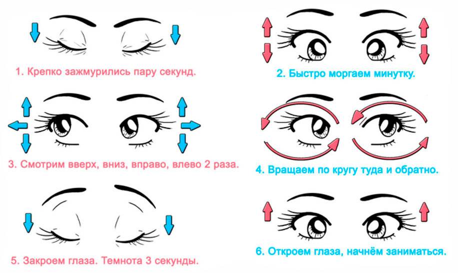 - зажмурьтесь и широко раскройте глаза, повторите это упражнение несколько раз, после чего поморгайте в течение 20-30 секунд;