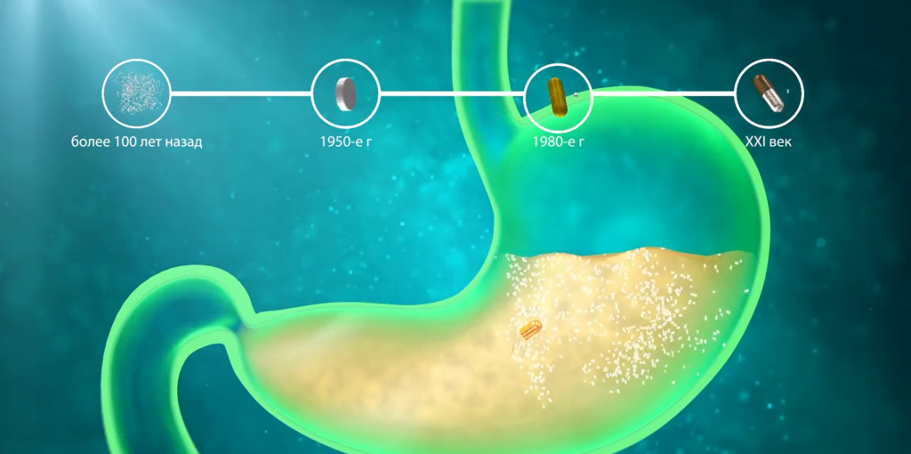 А что же таблетки? Таблетированные ферментные препараты появились еще в 1950-х гг. Это был первый шаг по усовершенствованию существующих на тот момент ферментных препаратов в форме порошка, поскольку порошок разрушался еще в желудке, не доходя до кишечника. Однако в ходе изучения действия таблеток, стало понятно, что они не могут одновременно попадать с пищей в кишечник, поскольку имеют цельную, неделимую форму7. Именно тогда ученые пришли к выводу, что для полноценной поддержки пищеварения препарату нужны маленькие частицы.
