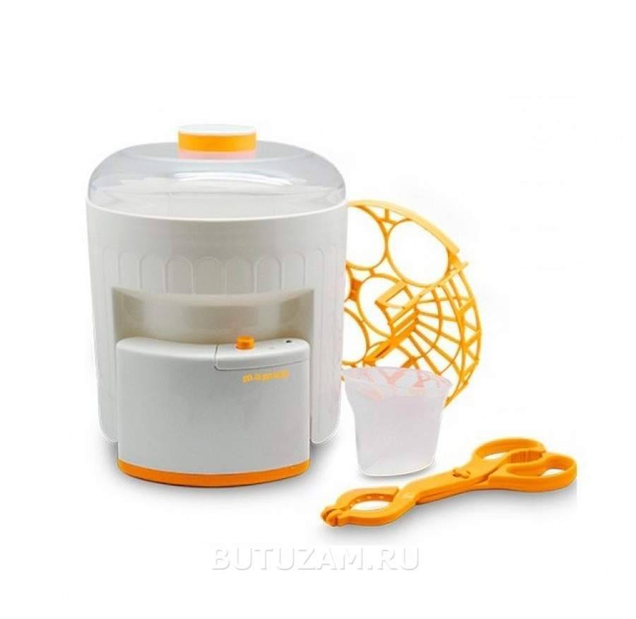 Данный аппарат может вместить в себя до 7 небольших бутылочек. Благодаря своей форме, стерилизатор занимает не много места. К минусам можно отнести то, что перед процессом обработки изделию необходимо некоторое время для разогрева. Стерилизация длится около 5 минут. Интересным фактом является то, что если оставить изделия в стерилизаторе на длительное время, аппарат будет обрабатывать их каждые 5 часов. Цена начинается от 2800 рублей.