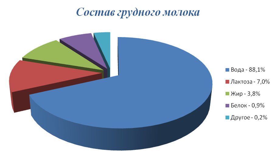 Зрелое молоко – это молоко, вырабатывающееся к началу 3-ей недели после родов (так происходит у подавляющего большинства женщин; у 5-10 % женщин зрелое молоко может появиться на неделю раньше). Состав женского молока (табл. 2.5.4.) во многом зависит от индивидуальных особенностей кормящей матери, качества ее питания и некоторых других факторов.