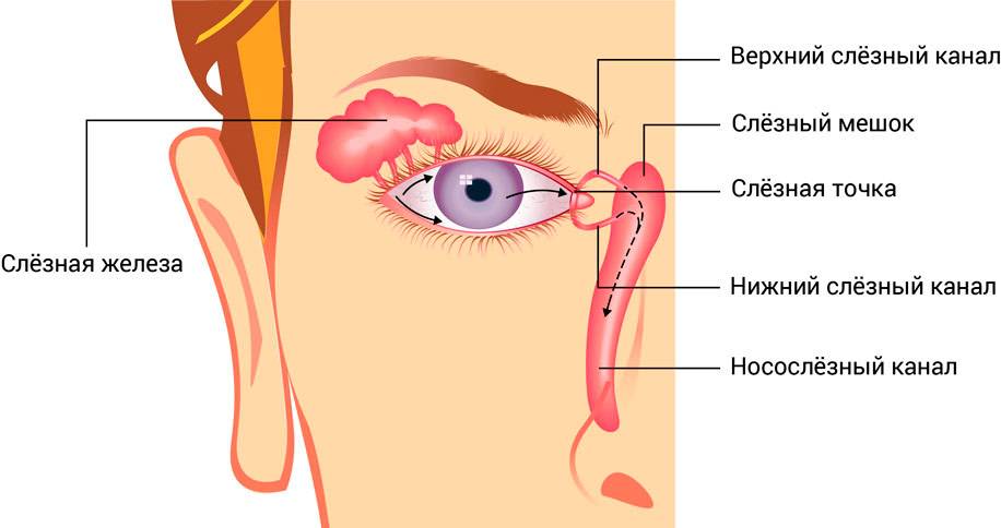 Слезная железа производит слезу, которая омывает глазное яблоко, а затем направляется в общий проток, который открывается в области нижней носовой раковины. Непроходимость вызывает нарушение регулярного оттока слезы, в результате слезная жидкость начинает застаиваться, что приводит к образованию конкрементов, состоящих из хлорида натрия и других неорганических веществ.